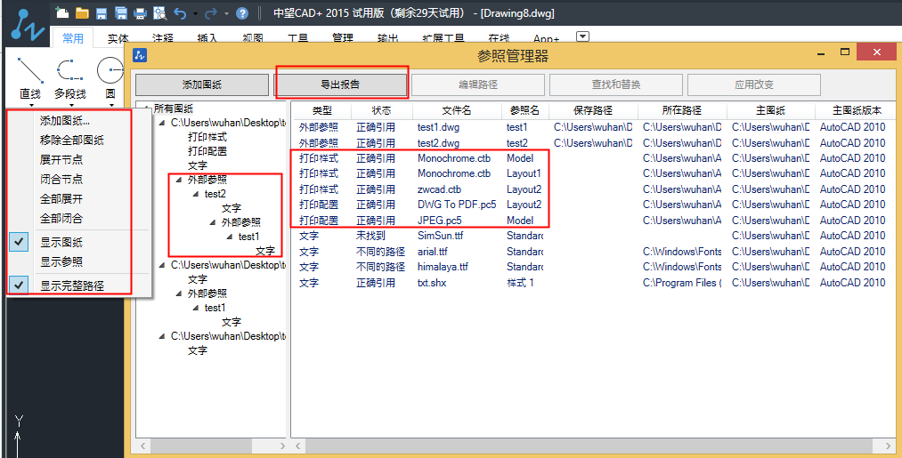 另一方面,luck18网址 2015 SP2在参照管理器功能上的提升也让用户对外来图纸的图形资源的管理更为高效。该版本的参照管理器增加了导出报告功能,软件以.csv格式导出参照管理器中所显示图纸的相关内容,如:类型、状态、文件名等,并且在树形结构区域的节点中增加了右键菜单,方便用户直接在参照管理器中对所打开的图纸进行包括图纸添加、参照及完整路径显示/关闭等一系列快捷操作,从而大幅度提升用户处理大量参照的工作效率。