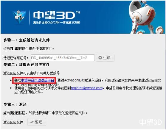 如果没有提前返回,请将激活号发送给3dservice@zwcad.com,注明情况,将由售后人员协助强制返还,并将激活号发还给您使用。