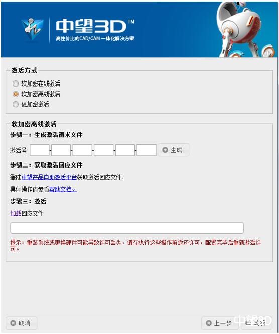2. 单击“激活”按钮开始激活操作。对应软加密用户,可以使用如下任一方式获取单机许可证: