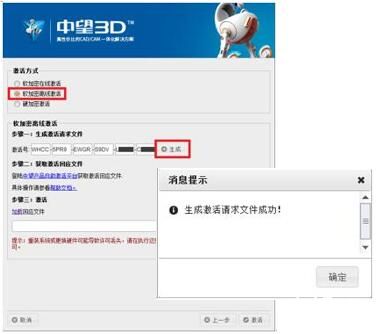 步骤一:输入24位完整“激活号”,单击“生成”按钮,在弹出的“另存为”对话框中指定其保存的路径并提示生成请求文件成功。