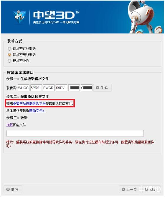 步骤三:获取了请求文件后,单击步骤三中的“加载”,找到下载返回的文件,并点击右下角“激活”。