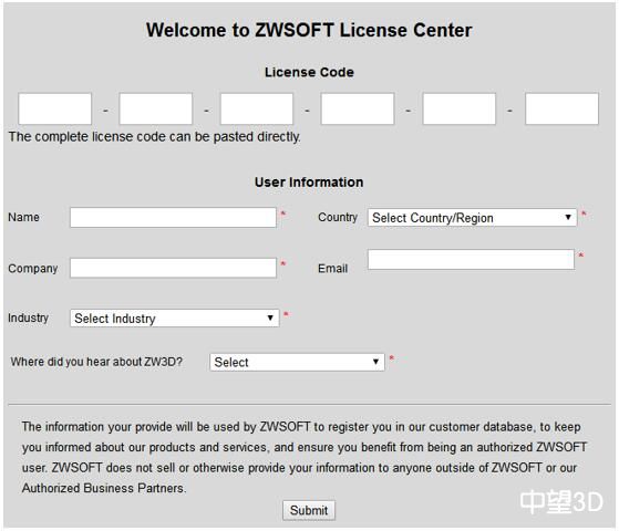 ②. 根据提示输入24位完整“激活号(License Code)”,并填写打星号的项目,填写完毕,点击“提交(Submit)”。其中: