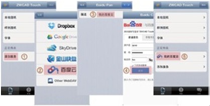 下部为云文件夹选择区域。作为内置第三方云存储服务的移动CAD,用户可以在该界面直接打开在百度云网盘、 金山快盘或Google Drive等网盘中存放的图纸,也可以复制网盘上的字体到当前设备。默认情况下,只有“添加服务” 一个按钮,点击即可按指引添加对应的网盘服务。在这一操 作过程中,用户可以添加对网盘的文字描述,也可以使用默 认的名称。最后,点击“存储”按钮回到上一级界面,即可 在“云文件夹”中添加一条网盘信息(图2)。