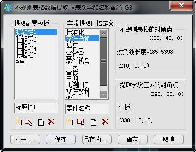 选取“提取表格数据”按钮,将出现“不规则表格数据提取->表头字段名称配置”对话框,对其中的代号、名称等字段内容的区域进行一个配置并保存为一个模板(以后对相同类型的图纸则就可以直接选择合适的模板),每个提取字段中的数据就预显在右下角位置。如示例,“图样名称”为“平板”。点取“确定”,数据就被提取到与定义提取字段名称相同的字段中。这样就自动完成了标题栏内容的转换。