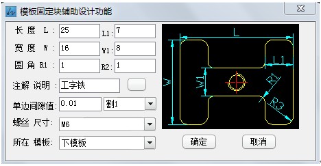 在大型连续模具中,连接块是必不可少的零件。通常情况下,设计师的做法是使用CAD软件画出形状并做为图块插入,然后进行修改。而在新龙腾冲压模具2014版中,我们只需要调用模板固定块辅助设计功能,输入相应的参数,软件即可生成连接块,而且带有加工说明。它大大简化了操作步骤,从而有助于提高设计效率。