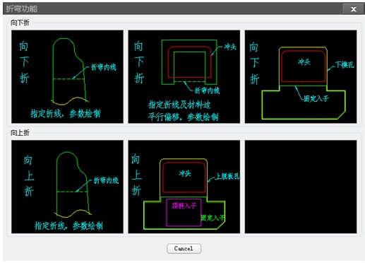 折弯功能分为向下折与向上折两种,每种都可以使用不同的参数设定方式,设计师可以根据不同情况选择某种方式进行设定: