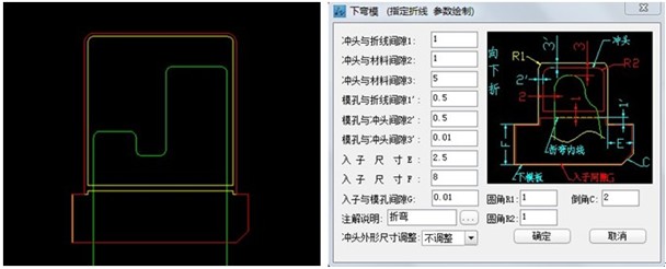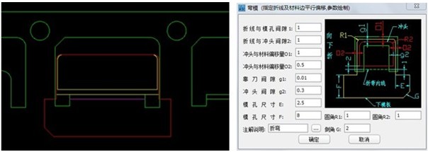 2.当折线形状比较规则时,我们可以使用“指定折线及材料边平行偏移,参数绘制”的方式来设定,如图4。设定参数后,选择折弯线及需要折弯的轮廓线,软件即可根据设定的内容自动绘出折弯冲头及入子,并带有加工说明。
