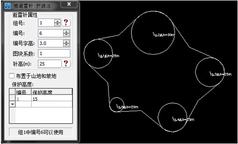 折线避雷与滚球避雷的操作基本类似,支持多个高度的联合区域防护,插入避雷针后自动计算联合防护区域;支持标注保护半径值、标注BX值、生成防雷保护表与计算书。需要强调的是,折线法避雷设计的计算方法以及参照设计规范与滚球法避雷设计有所不同,这种方法多用于电力行业的工程设计。