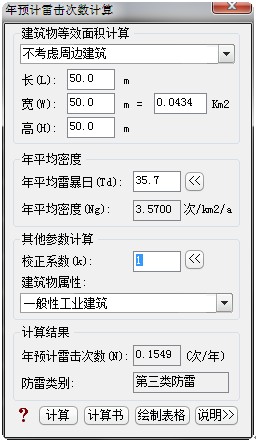 值得一提的是,软件支持计算建筑物的年预计雷击次数,且这些计算依据来自于国家标准GB50057-2010《建筑物防雷设计规范》。该程序加入了是否考虑周边建筑的影响,计算防雷类别,并且计算结果可绘制成表格形式,也可生成详细的计算书,设计师可根据企业的标准规范自由选择。