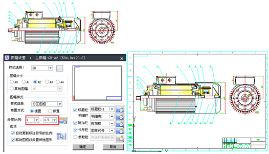 如下图所示,软件设计了两个可编辑的下拉框,分别设置放大和缩小的比例系数。点取下拉的箭头,其中列出了国标推荐使用的比例。当然,设计师也可以通过修改设置自己的比例因子,当设置了其中一个值时,另一个值自动还原为1。