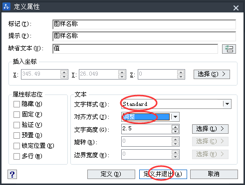 打开需要自定义的标题栏样式,把需要自动显示的内容(如公司名称)用文字做好之后,进行属性块的制作。在命令栏输入:att,将弹出的【定义属性】对话框中的标记和提示都改为:图样名称。文字样式及对齐方式的设置如下图所示,完成设置后选择“定义并退出”,然后指定到标题栏中图样名称的位置上。