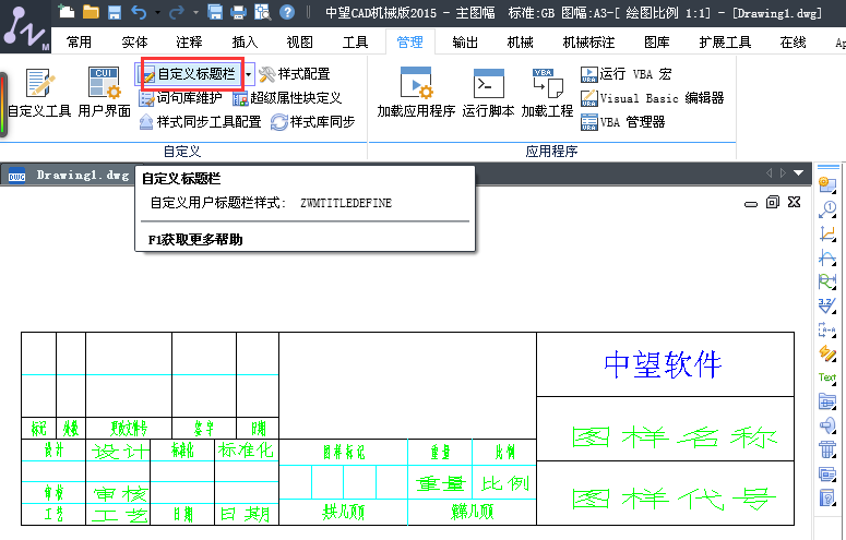 打开luck18网址机械版的Ribbon界面,在“管理自定义”中拾取“自定义标题栏”按钮,或者直接输入命令:_ZWMTITLEDEFINE,对新建的标题栏进行命名,如:zwcad。