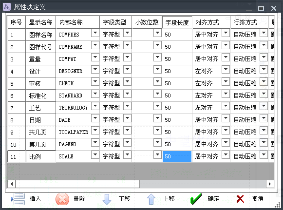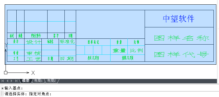 其中定义属性块的时候,类型一样的可以直接通过复制获得。将所有需要填写的地方定义好了之后,最终得到的标题栏样式如下: