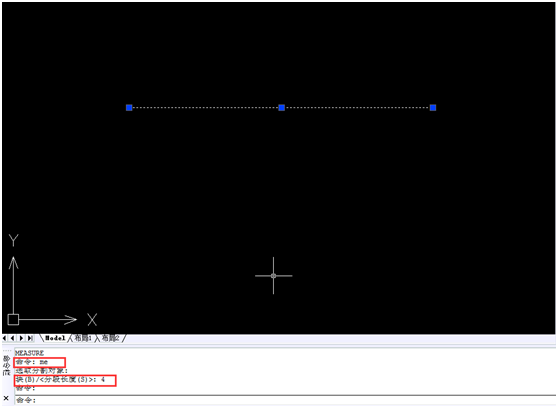 在CAD绘制一条直线——在命令行输入me——选中要等分的直线——输入等分距离(例如4)——回车——再次点击等分的直线