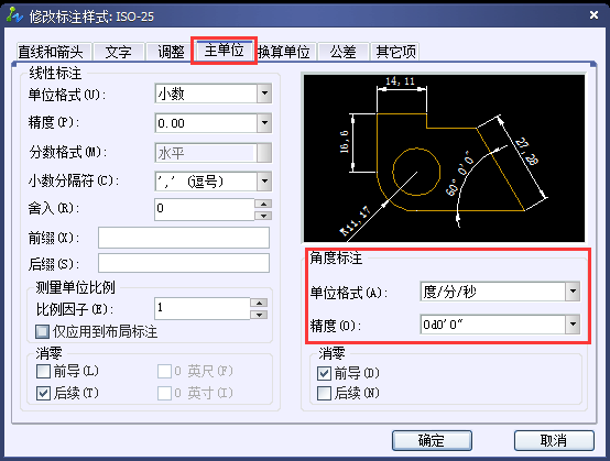 标注——标注样式——修改——主单位——角度标注——单位格式选择“度/分/秒”;精度选择“0d0’0’’”,参考下图