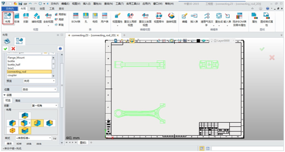 第四步:选择A2图纸,进入到工程图模块。选择布局,选择视角以及默认的视图布局,并且我们把“显示零件标注”勾选上,这样就可以生成三个视角的视图布局。