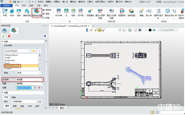 第五步:选择轴侧剖视图,并且选择需要插入的零件,在3D名称中,选择我们之前创建的“剖面图”,那么这样的话,就可以生成轴侧剖视图。通过这个轴侧剖视图,我们可以更加清晰的看到产品的内部结构。
