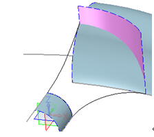 结合前面UV面所创建的曲面,以及第八步创建的拉伸面,使用曲面修剪功能,修剪掉两者所交互的内侧部分,修剪时应注意箭头向外侧,如下图18、图19所示。
