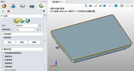 点击“造型”模块中的“圆角”命令,对外壳的四周进行倒角。