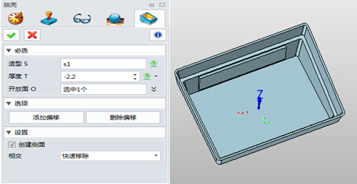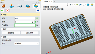 点击“造型”模块中的“抽壳”命令,选择造型输入厚度“-2.2”,开放面为“顶面”如图14所示。