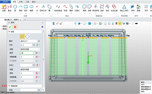再点击草图中“阵列”命令,输入方向是“Y负轴”,数目是“29”,间距距离为“3”如图18所示,绘制完成后,点击退出草图。