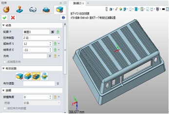 点击“造型”模块中的“拉伸”命令,输入拔模角度和外部偏移数值,详细参数参考图5,输入完后点击确定。