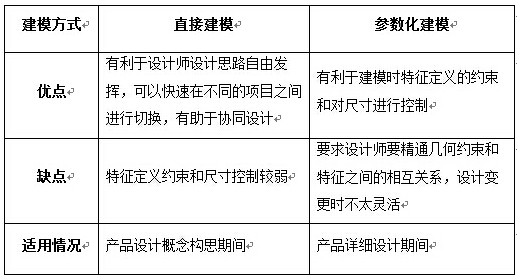 目前,越来越多的设计师选择采用三维CAD软件的建模功能来进行产品设计,最常用的建模方式有参数化建模和直接建模两种。如下表,这两种建模方式各有特点,设计师应根据设计内容的需要灵活选择最优的方式。