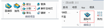 使用“曲面”模块中的“删除环”和“造型”模块中的“分割”功能进行提取分割(图6-图8),这样就可以不用担心特征相关联无法操作的情况,对于设计师来说,可以让其设计思路更加自由。