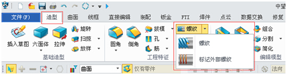 如图1所示,xelega3D的螺纹生成操作命令是在“造型”模块中,其具有两个操作命令:“螺纹”和“标记外部螺纹”。