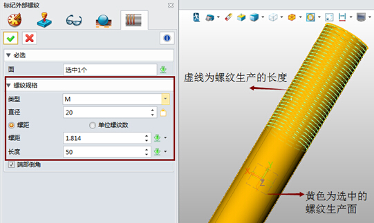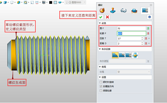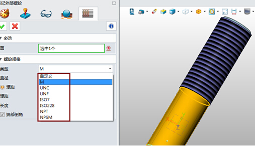 类型:生成螺纹的标准类型,注意这里默认的螺纹直径是圆柱的外径。