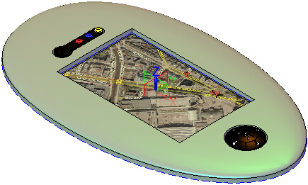 首先我们来看看产品设计前与设计后的效果对比,如图1所示,这是一个完整的导航仪,以及导航仪内部的三维电器和结构部分,包含电路板、操控按钮和显示屏等。本实例的任务,就是要基于这些现成的内部电路板、操控按钮、显示屏等,设计出整个GPS的外壳。