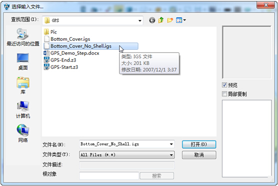 在“数据交换”模块下使用“输入”命令,输入文件“Bottom_Cover_No._Shell.igs”(图5)。