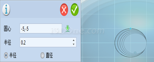 5、选择平面绘制区域,点击草图绘制,选择圆形,输入圆心(-5,0),半径5,可得: