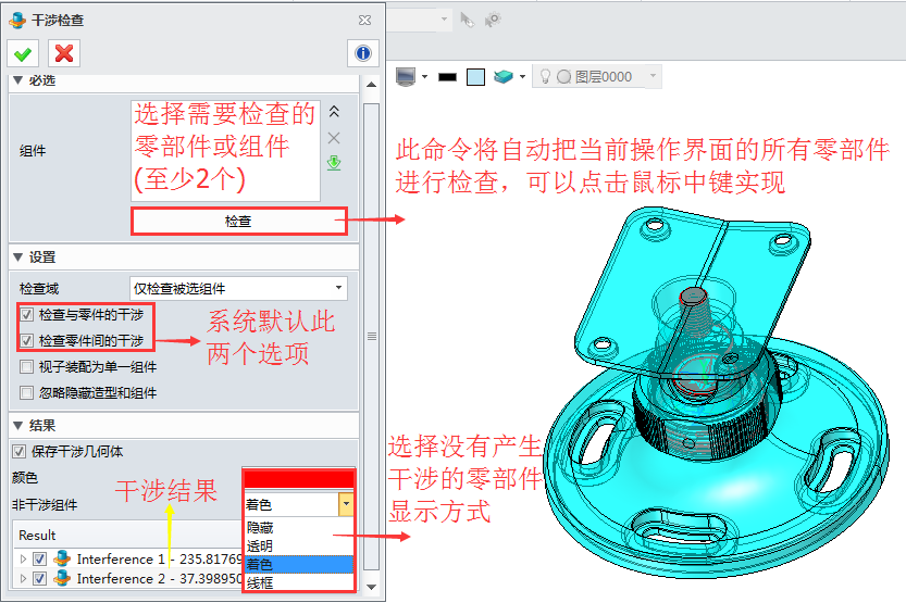 模式2:检查产品的所有零部件的干涉情况,可以点击图1中的“检查”命令,也可以单击鼠标中键进行选择。