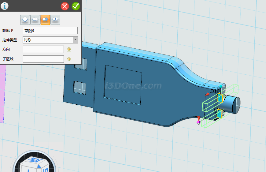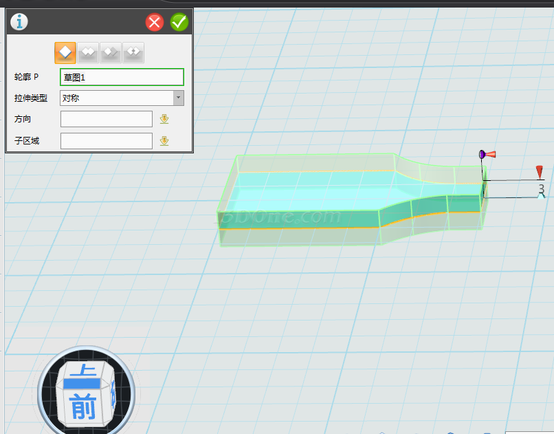 ,将步骤1中的草图进行拉伸,拉伸类型选择“对称”,厚度输入,勾选确认,如图所示:
