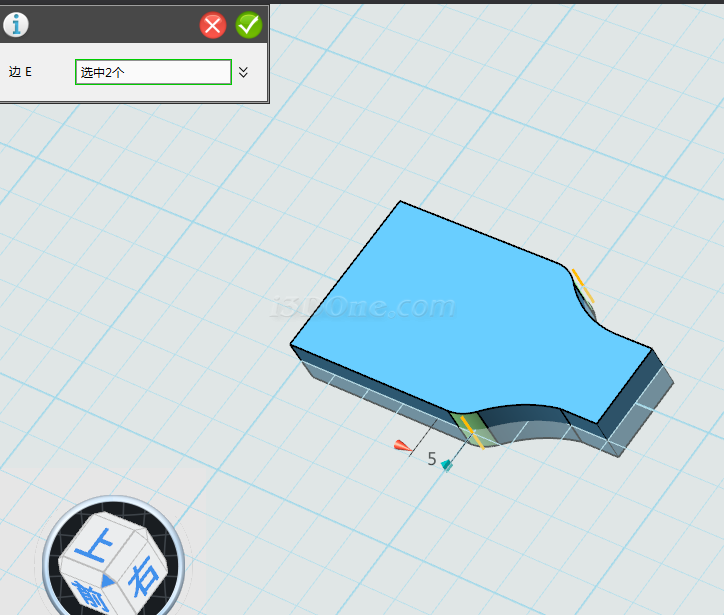 ,对步骤2的拉伸体,圆角,半径“5”,勾选确认。