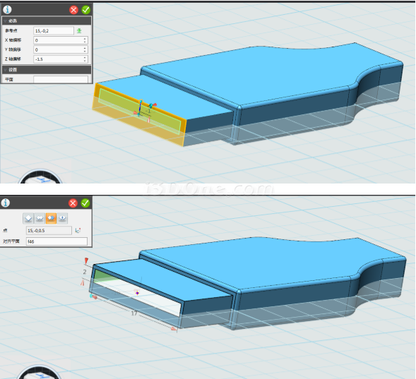 ,位置选择“偏移”,并选择上边线的中点,再向Z轴偏移“-1.5”,对齐平面选择侧面,如图所示黄色面,高度-10,长度17,宽2,选择布尔运算中的“差”,勾选确认。