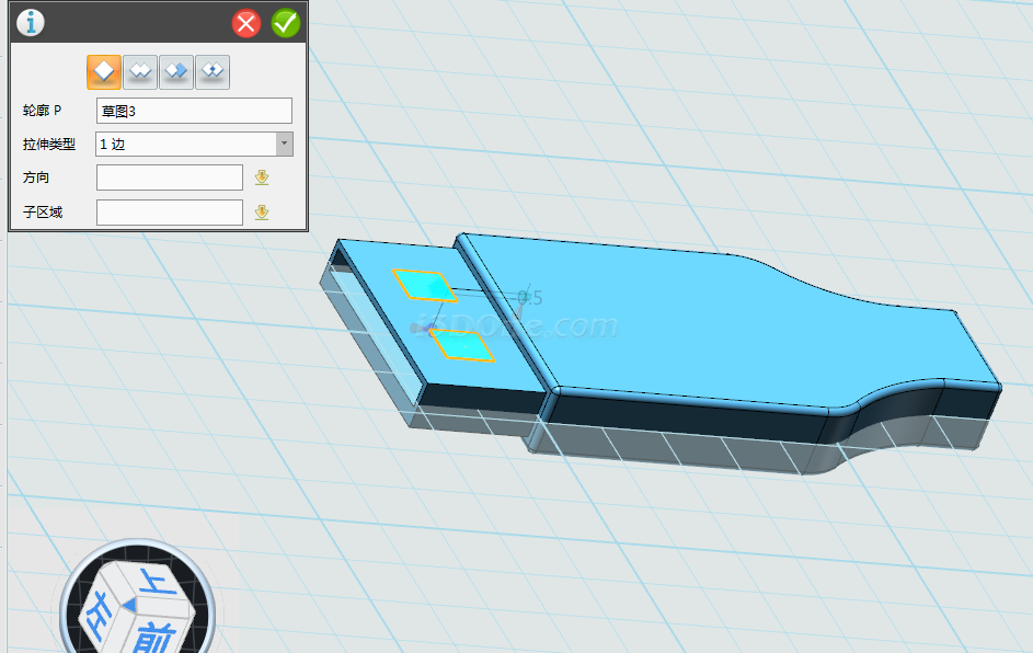 ,将步骤9中的草图进行拉伸,拉伸类型选择“对称”,厚度输入“-0.5”,勾选确认,如图所示: