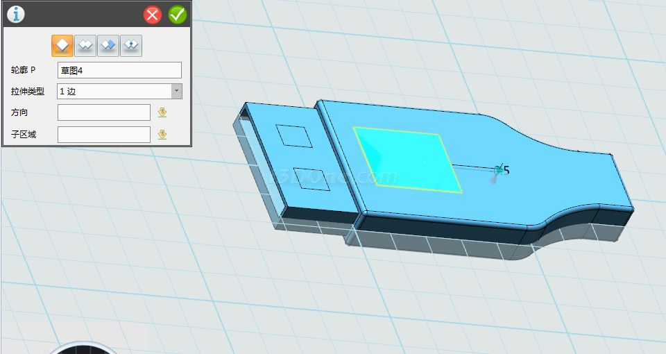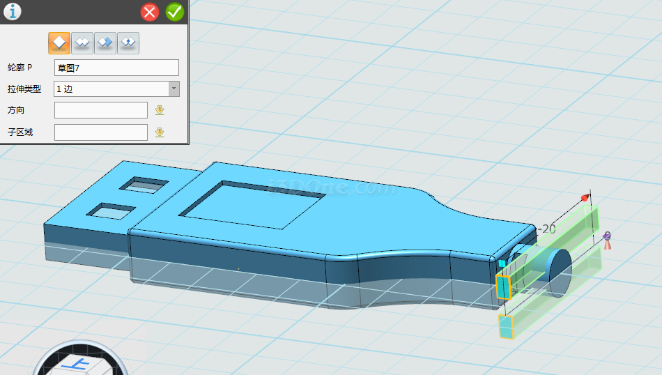 ,将步骤18中的草图进行拉伸,拉伸类型选择“一边”,厚度输入“-20”,选择差运算,勾选确认,如图所示: