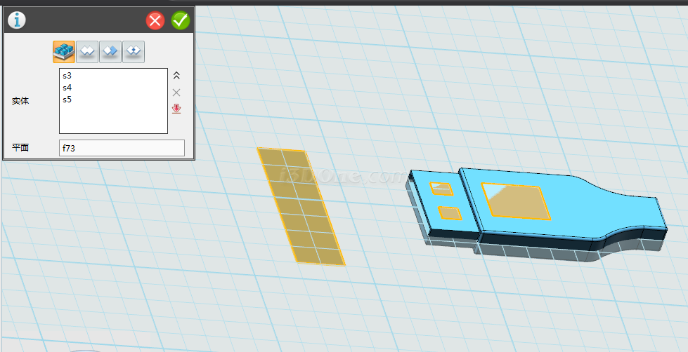 ,选择步骤8和10的三个拉伸体,镜像平面选择步骤11做的辅助平面。
