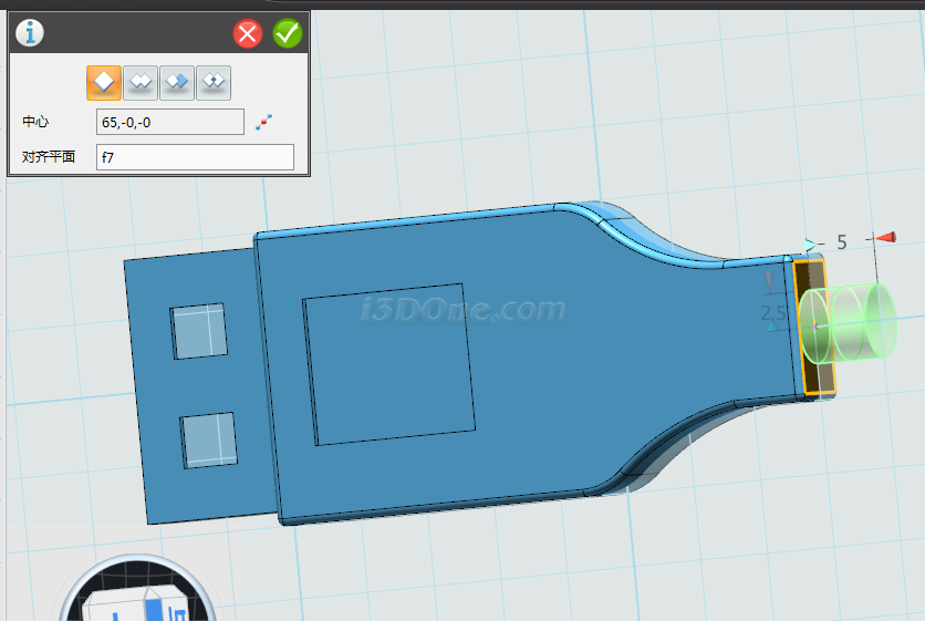 ,位置选择“两者之间”,并选择两个对角点,对齐平面选择侧面,如图所示黄色面,高度5,半径2.5,勾选确认。