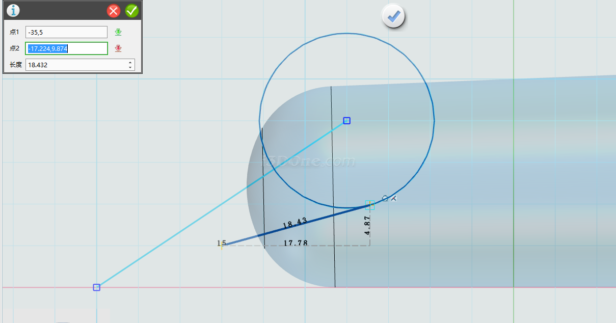 绘制直线。如图(点1位置设为-35,5,点2自动捕捉圆的相切点位置