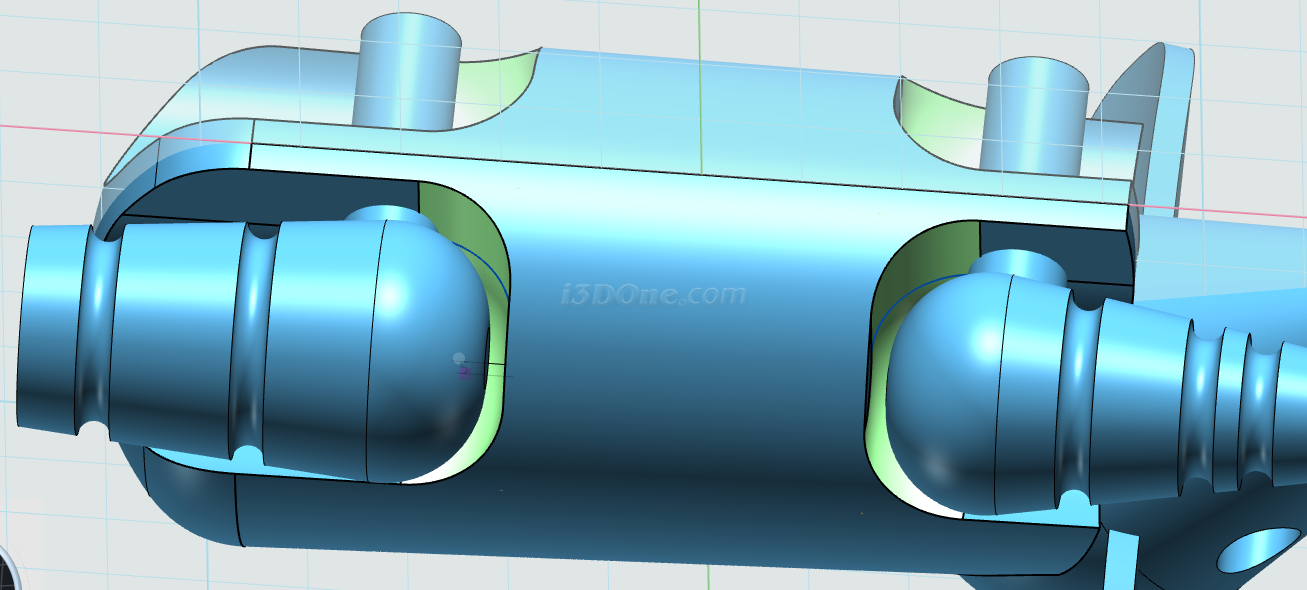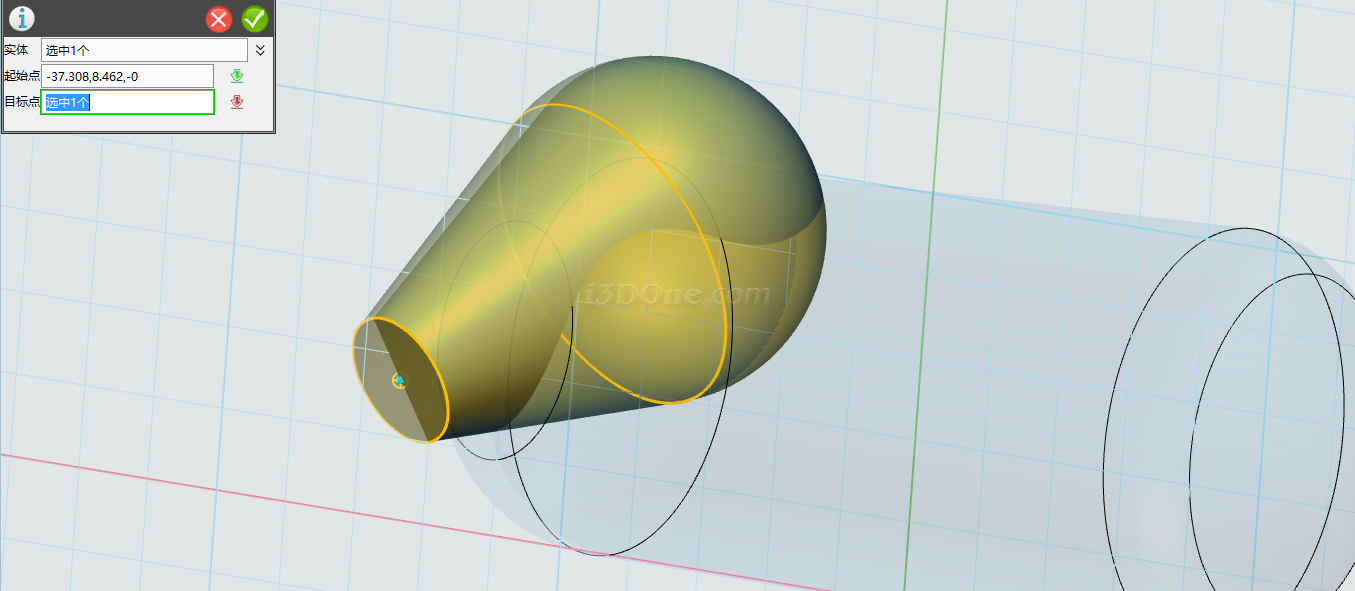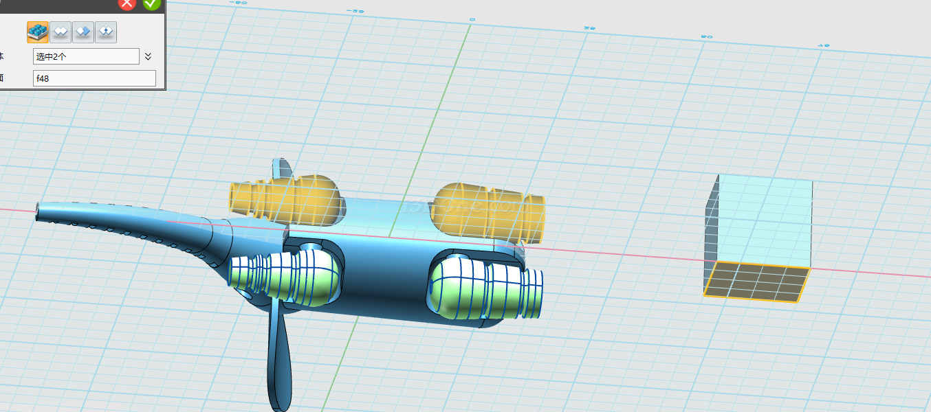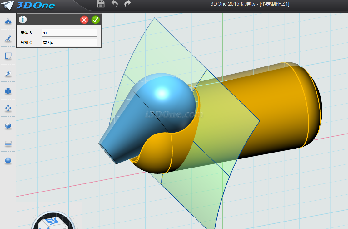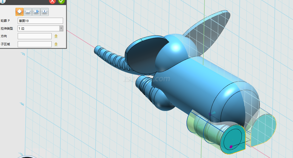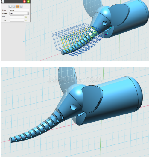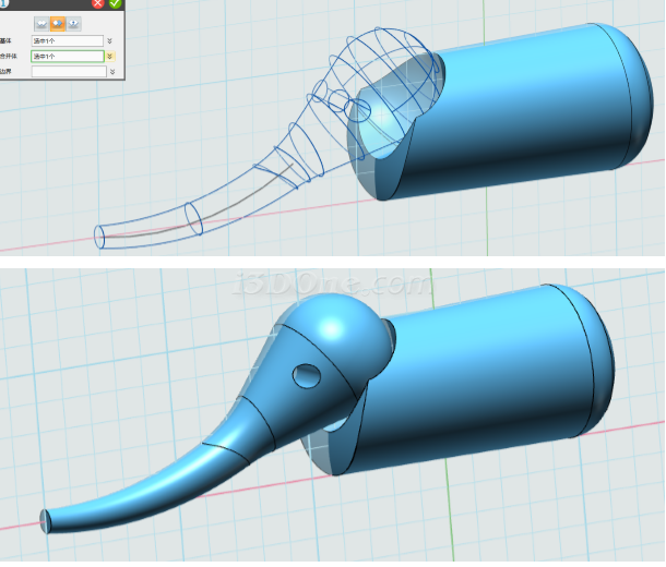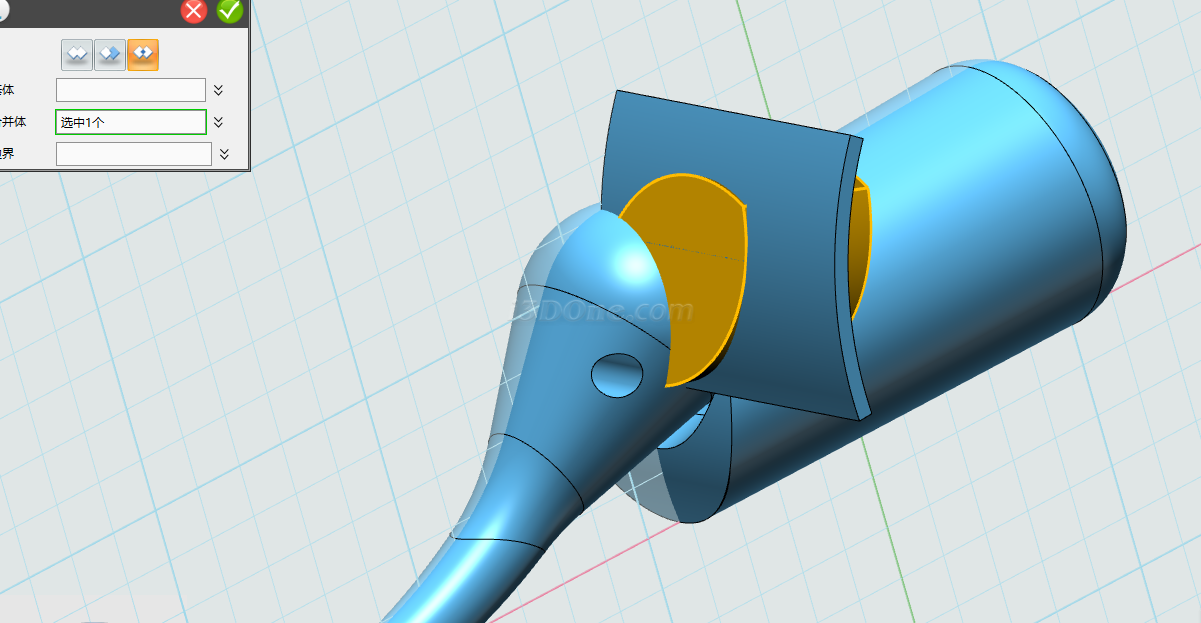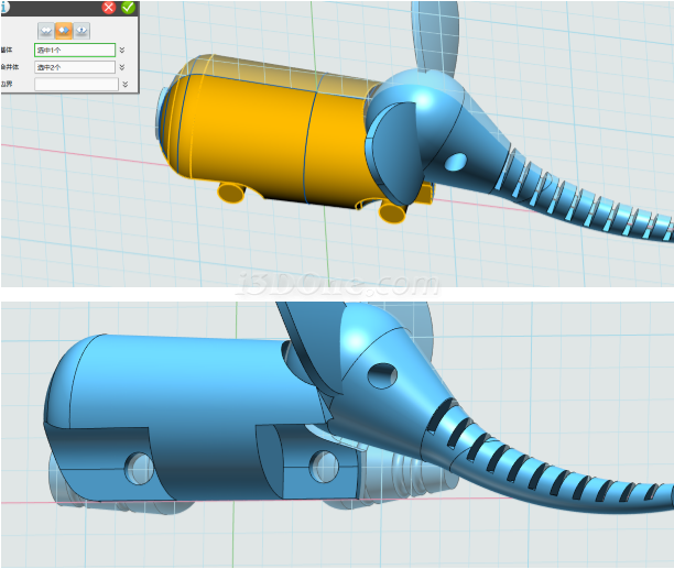 基体选择大象身体,合并体选择拉伸的两个圆柱,布尔运算设为减运算,如图完成合并: