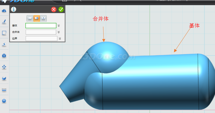 完成隐藏,选择组合编辑命令,如图,基体选择身体部分,合并体选择上步骤旋转的实体: