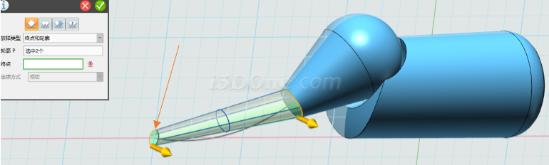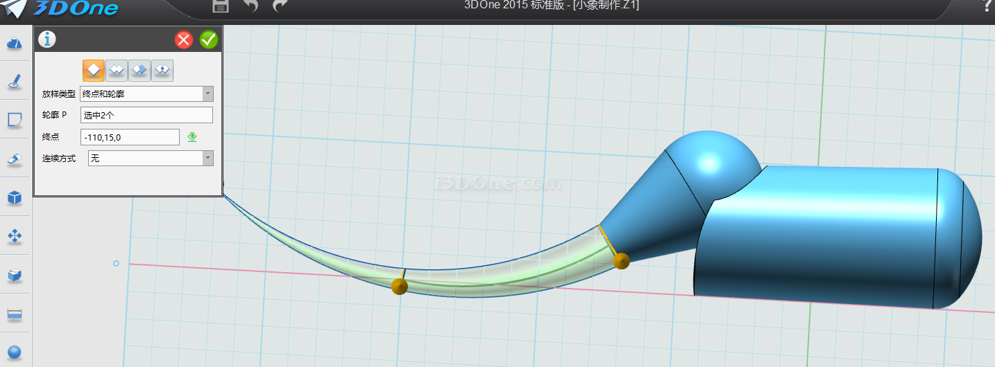 放样类型选择终点和轮廓,终点设为如图,连续方式为无