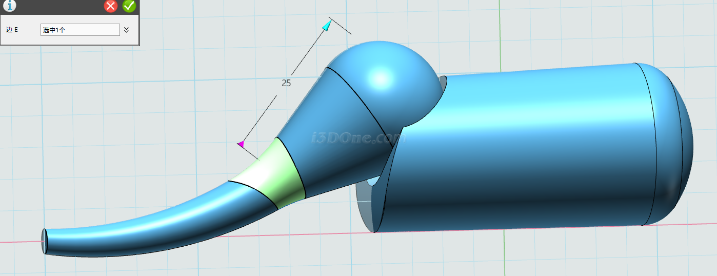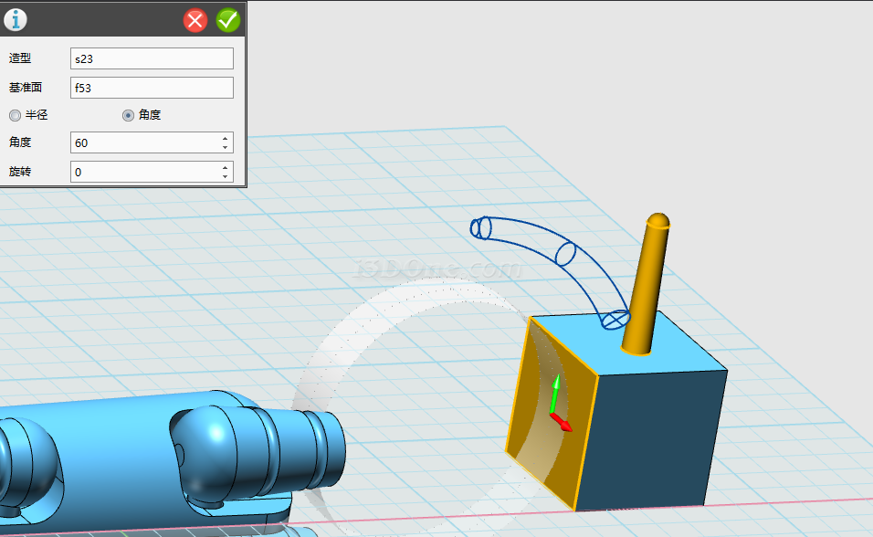 完成圆角绘制,选择圆柱折弯命令,如图,造型选择圆台,基准面选择如图所示平面,角度设为60°: