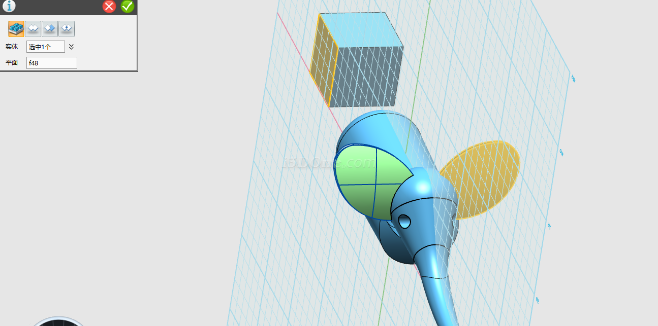 选择镜像命令,实体选择象牙,镜像面选择如图所示,布尔运算设为加运算: