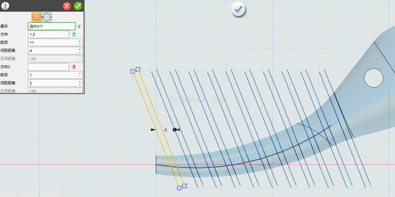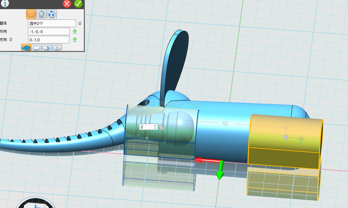 选择阵列命令,阵列实体选择上步骤拉伸的实体:如图,阵列距离为42,数量2个,方向选择红色箭头方向如图: