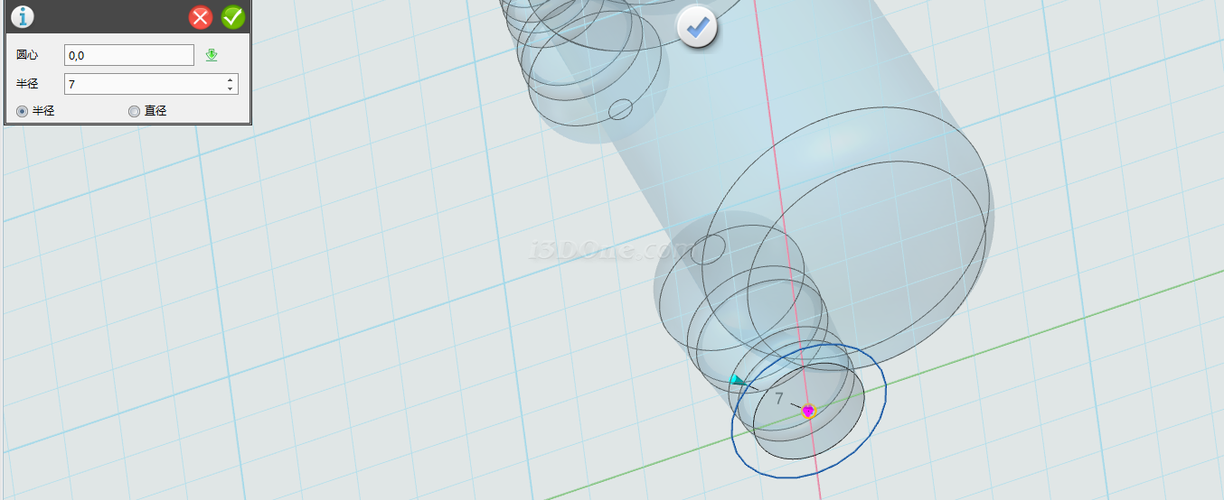 选择圆命令,在网格平面上绘制圆,位置如图: