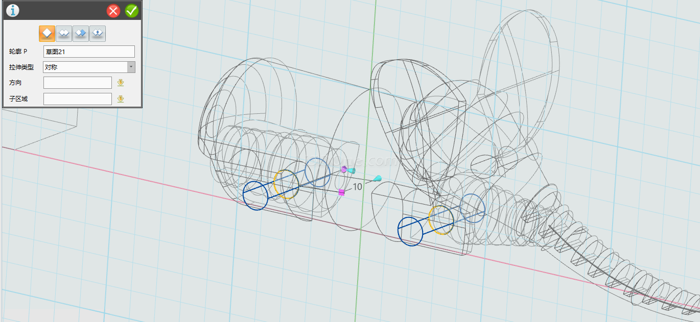 选择拉伸命令,同样调整显示模式为线框模式,拉伸绘制的圆,对称拉伸10,布尔运算设为加运算,如图: